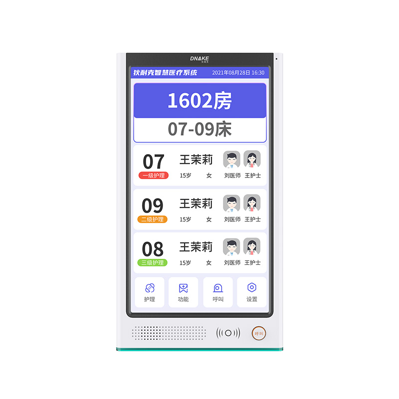 設置在病房門(mén)口的終端設備,主要用于顯示病房相關(guān)信息,內置簡(jiǎn)易醫護工作站,支持病房床位一覽、患者動(dòng)態(tài)跟蹤、呼叫對講、增援求救等多種呼叫類(lèi)型,信息齊全,及時(shí)響應醫護需求,實(shí)現智能化醫護管理。