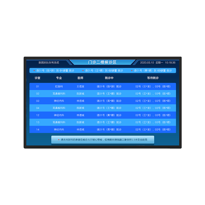 1)掛號大廳部署LED拼接電視墻,進(jìn)行屏幕劃分,分別顯示各科室目前有多少人排隊,預計完成時(shí)間,掛號的多重病患的病人可以根據屏幕提示自主選擇看病次序。
